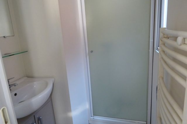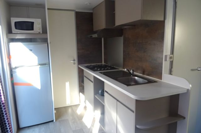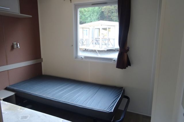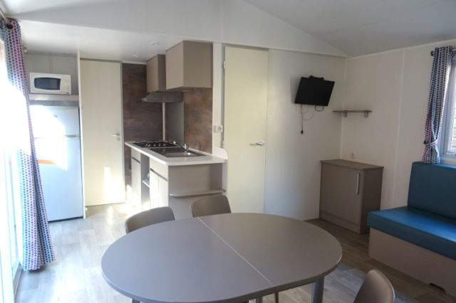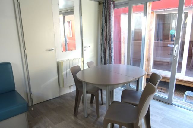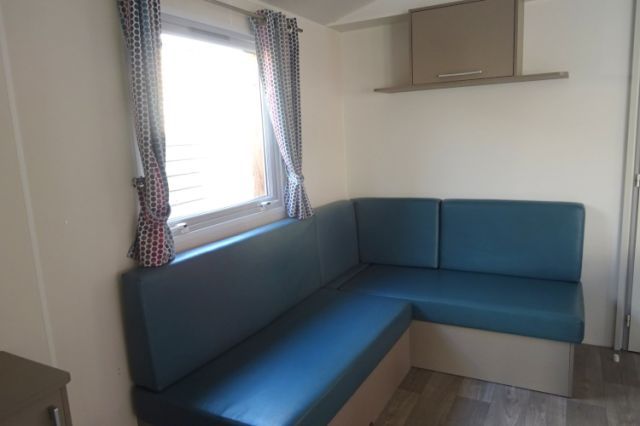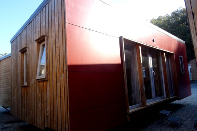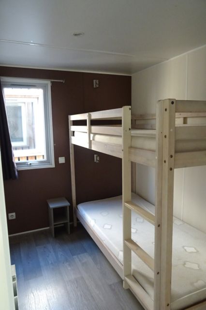 Mobil home TRIGANO modèle spécifique INDIGO en 2 chambres. Bardage bois sur 2 cotés et arrière, bordeaux en façade. Double vitrage, isolation montagne. Une double entrée coulissante, donnant sur l'espace jour: cuisine équipée, avec réfrigérateur-congélateur, hotte, micro-ondes. Coin salon avec banquette en L; Coin repas indépendant. Deux chambres (dont une avec lits superposés), avec rangements, chevet et penderie. Convecteurs dans chambres; Salle d'eau avec meuble sous vasque, douche et sèche serviettes. WC séparé. Le +: isolation montagne. Transport inclus 50 km, TVA récupérable.