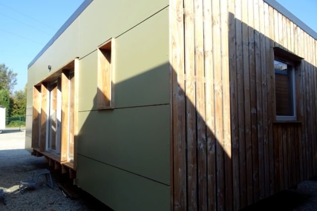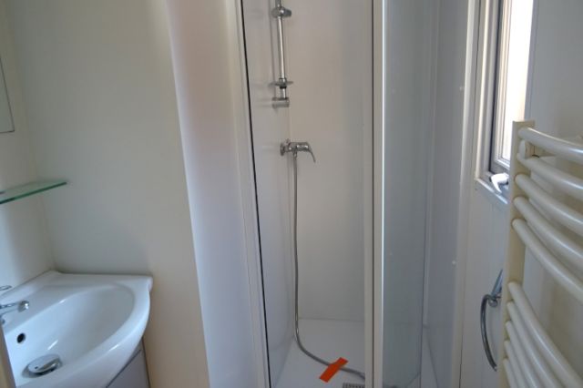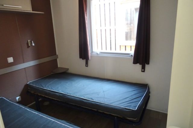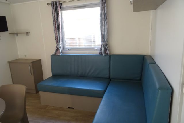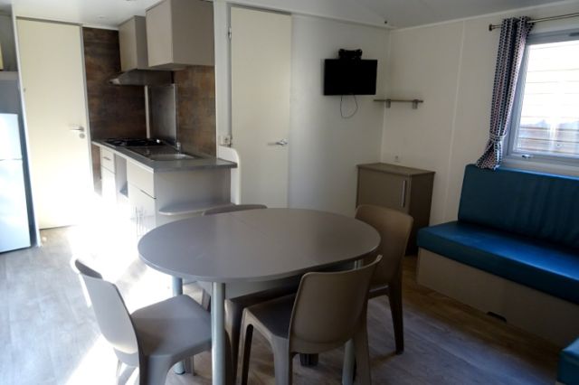 Mobil home TRIGANO modèle spécifique INDIGO en 2 chambres. Bardage bois sur 2 cotés et arrière, vert en façade. Double vitrage, isolation montagne. Une double entrée coulissante, donnant sur l'espace jour: cuisine équipée, avec réfrigérateur-congélateur, hotte, micro-ondes. Coin salon avec banquette en L; Coin repas indépendant. Deux chambres (dont une avec lits superposés), avec rangements, chevet et penderie. Convecteurs dans chambres; Salle d'eau avec meuble sous vasque, douche et sèche serviettes. WC séparé. Le +: isolation montagne. Transport inclus 50 km, TVA récupérable.