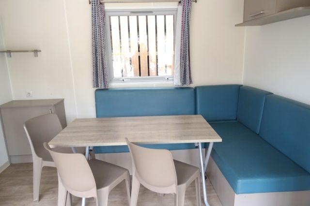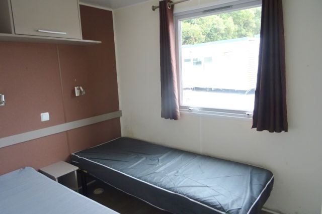 Mobil home TRIGANO modèle spécifique INDIGO en 2 chambres. Bardage bois sur 2 cotés et arrière, rouge en façade. Double vitrage, isolation montagne. Une double entrée coulissante, donnant sur l'espace jour: cuisine équipée, avec réfrigérateur-congélateur, hotte, micro-ondes. Coin salon avec banquette en L; Coin repas indépendant. Deux chambres (dont une avec lits superposés), avec rangements, chevet et penderie. Convecteurs dans chambres; Salle d'eau avec meuble sous vasque, douche et sèche serviettes. WC séparé. Le +: isolation montagne. Transport inclus 50 km, TVA récupérable.