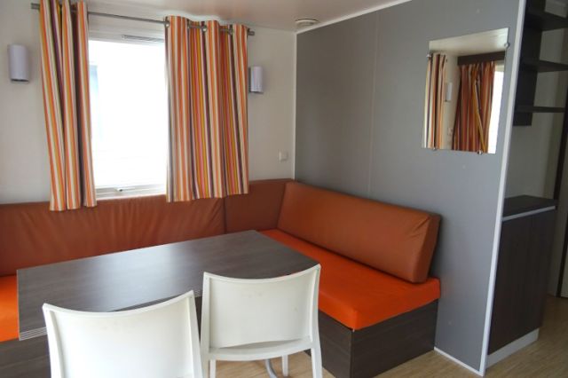 A SAISIR très beau mobil home en 2 chambres; Bardage PVC beige, avec terrasse pignon. Une grande entrée double coulissante donnant sur l'espace jour; Beau coin repas avec banquette en L; Cuisine équipée avec hotte et réfrigérateur-congélateur. 2 grandes chambres, avec chevet, penderie, rangements et convecteur. Les chambres sont aussi équipées de volets roulants. Salle d'eau avec douche, meuble sous vasque et convecteur. Mobil home moderne, avec de beaux espaces. Les +: Terrasse pignon sur toute la largeur, isolation renforcée. Transport inclus 50 km, TVA récupérable.