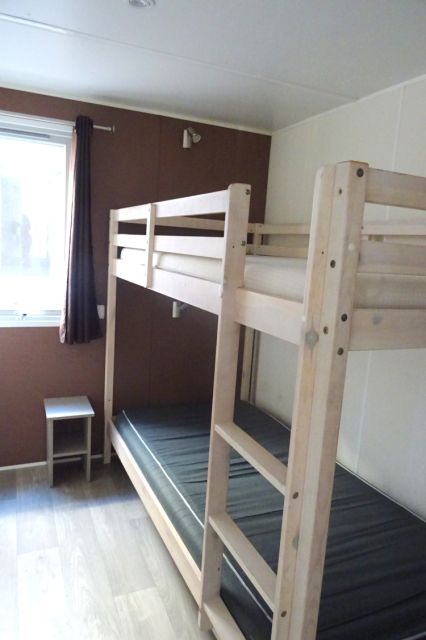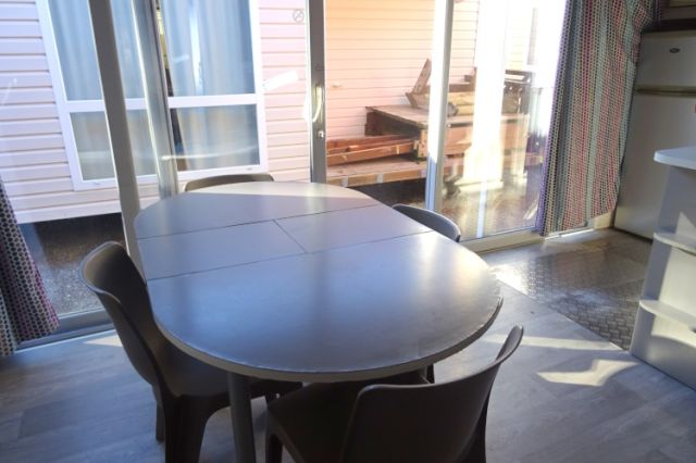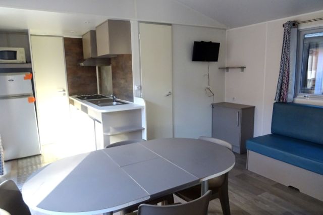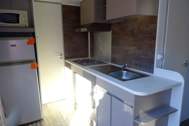Mobil home TRIGANO modèle spécifique INDIGO en 2 chambres. Bardage bois sur 2 cotés et arrière, rouge en façade. Double vitrage, isolation montagne. Une double entrée coulissante, donnant sur l'espace jour: cuisine équipée, avec réfrigérateur-congélateur, hotte, micro-ondes. Coin salon avec banquette en L; Coin repas indépendant. Deux chambres (dont une avec lits superposés), avec rangements, chevet et penderie. Convecteurs dans chambres; Salle d'eau avec meuble sous vasque, douche et sèche serviettes. WC séparé. Le +: isolation montagne. Transport inclus 50 km, TVA récupérable.