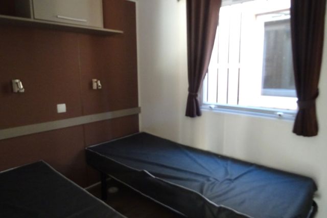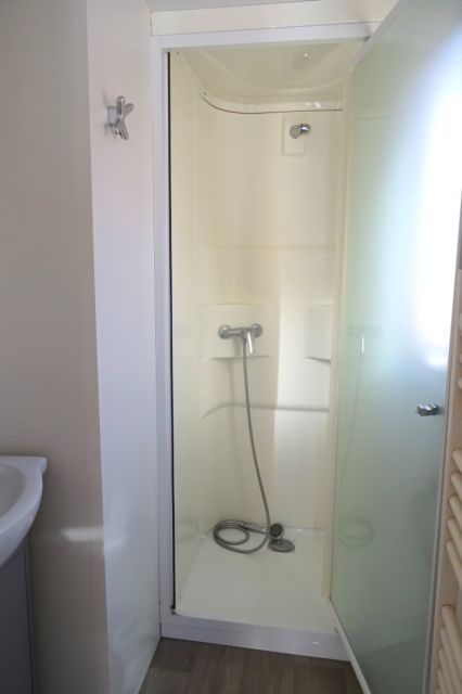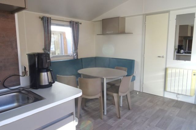 Mobil home TRIGANO modèle spécifique INDIGO en 2 chambres. Bardage bois sur 2 cotés et arrière, rouge en façade. Double vitrage, isolation montagne. Une double entrée coulissante, donnant sur l'espace jour: cuisine équipée, avec réfrigérateur-congélateur, hotte, micro-ondes. Coin salon avec banquette en L; Coin repas indépendant. Deux chambres (dont une avec lits superposés), avec rangements, chevet et penderie. Convecteurs dans chambres; Salle d'eau avec meuble sous vasque, douche et sèche serviettes. WC séparé. Le +: isolation montagne. Transport inclus 50 km, TVA récupérable.
