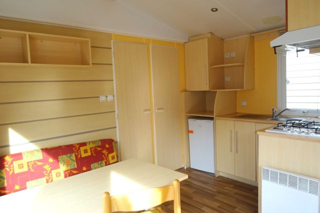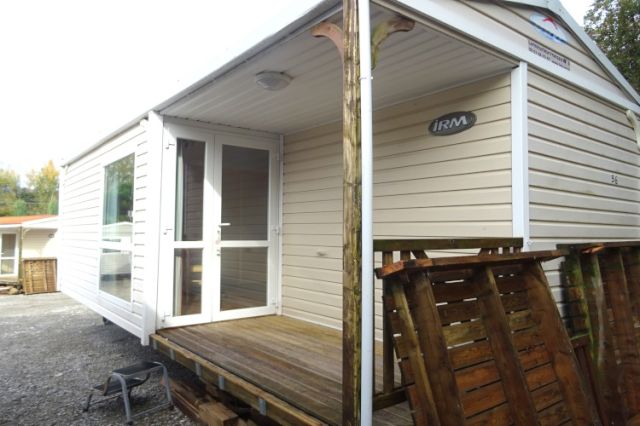 NOUVEAU! IRM modèle LOGGIA en 2 chambres; Bardage PVC crème, double pente et double vitrage. Une terrasse intégrée avec son extension pour profiter des extérieurs. Une belle entrée donnant sur l'espace jour, très lumineux avec sa baie vitrée. Coin repas avec banquette et cuisine équipée ( frigo top, hotte). 2 chambres avec caissons de rangement, chevet et penderie. Salle d'eau avec tablette, meuble sous vasque et douche. WC séparé. Mobil home avec de beaux volumes. Le +: terrasse avec extension. A voir ! Transport inclus 50 km, TVA récupérable.