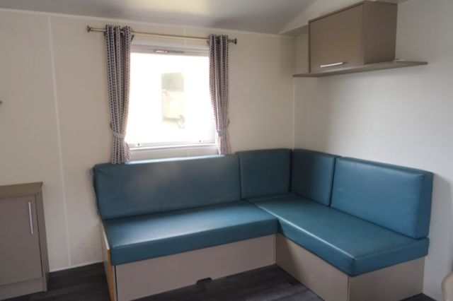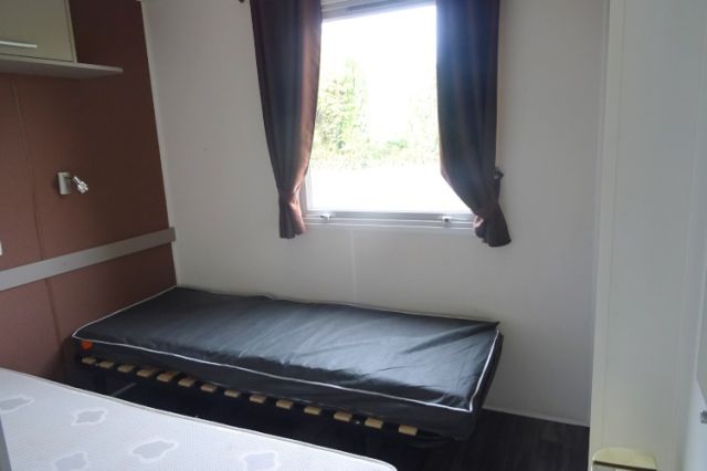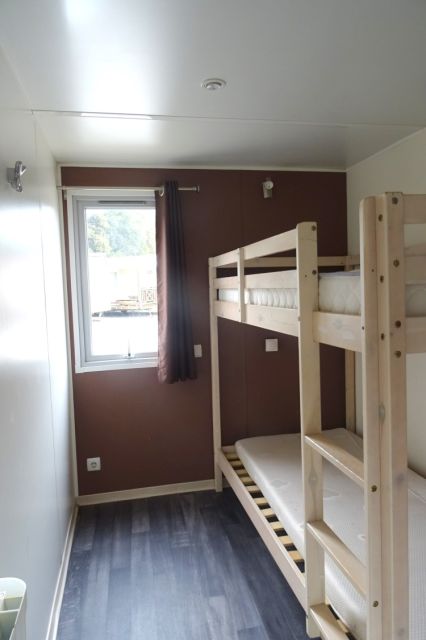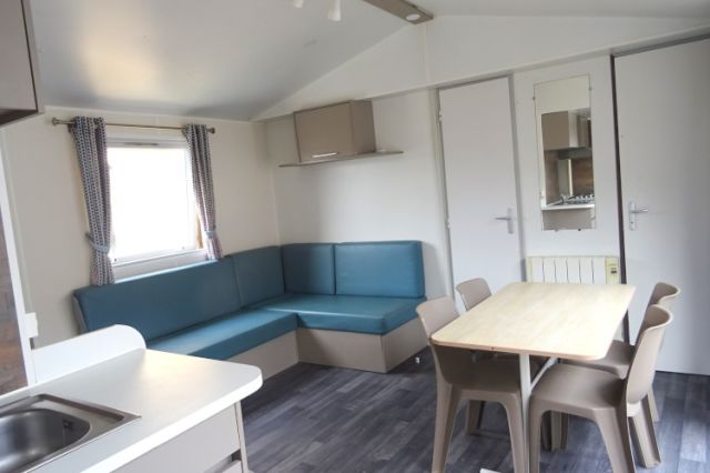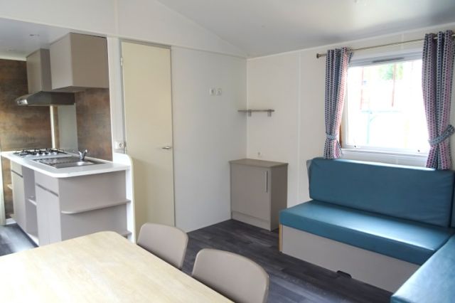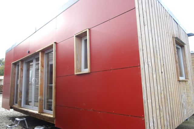 Mobil home TRIGANO modèle spécifique INDIGO en 2 chambres. Bardage bois sur 2 cotés et arrière, rouge en façade. Double vitrage, isolation montagne. Une double entrée coulissante, donnant sur l'espace jour: cuisine équipée, avec réfrigérateur-congélateur, hotte, micro-ondes. Coin salon avec banquette en L; Coin repas indépendant. Deux chambres (dont une avec lits superposés), avec rangements, chevet et penderie. Convecteurs dans chambres; Salle d'eau avec meuble sous vasque, douche et sèche serviettes. WC séparé. Le +: isolation montagne. Transport inclus 50 km, TVA récupérable.