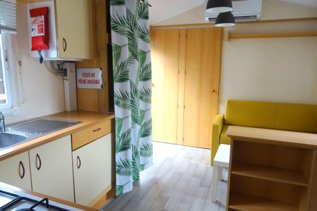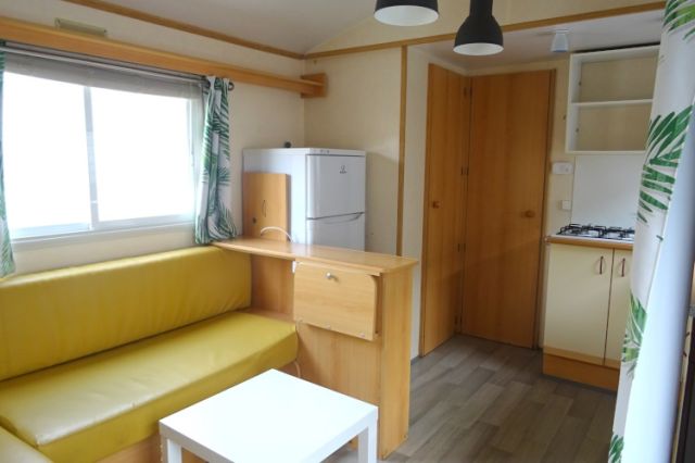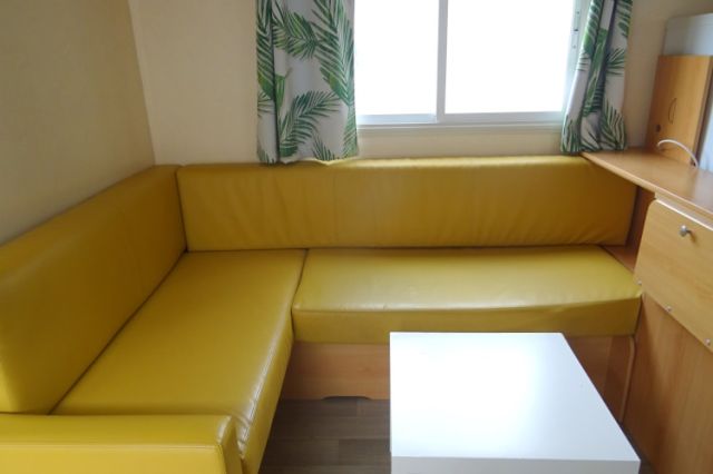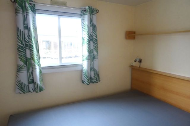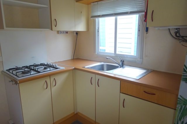Mobil home ROLLER en 2 chambres; Bardage couleur bleu ciel, double pente, simple vitrage. Implantation centrale, avec coin repas (banquette en L) et cuisine équipée. 2 chambres, avec penderie et tablettes. Salle d'eau avec douche; WC séparé. Equipé clim. Bonne isolation avec panneaux sandwiches. Mobil home idéal pour petit emplacement. A voir. Transport inclus 50 km, TVA récupérable.