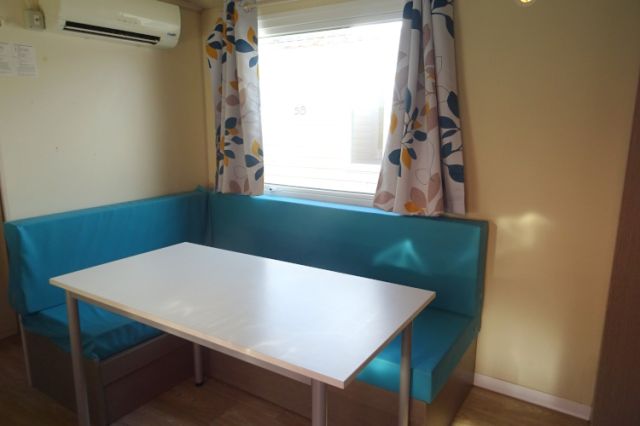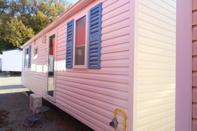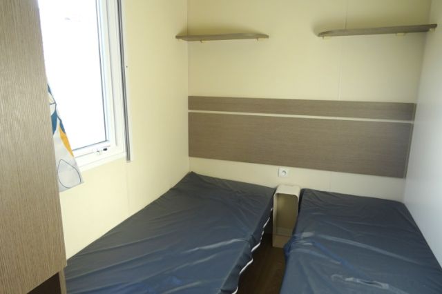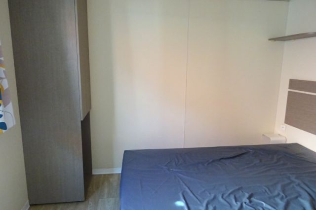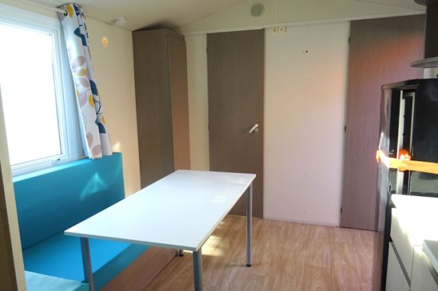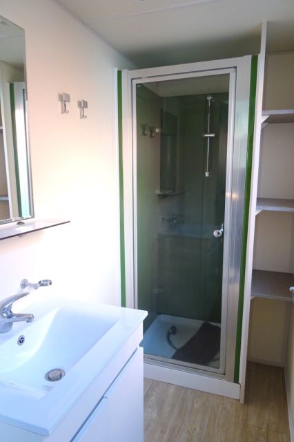NOUVEAU! mobil home WATIPI en 2 chambres; Bardage PVC blanc, double pente et double vitrage. L'entrée donne sur l'espace jour: Coin repas avec banquette; cuisine équipée avec four, hotte, réfrigérateur-congélateur. Equipé clim pour un maximum de confort. 2 chambres, avec chevets, penderie et tablettes. Salle d'eau avec douche, tablettes de rangement et meuble sous vasque. WC séparé. Beaucoup de volume pour ce produit de faible encombrement; A voir! Transport inclus 50 km, TVA récupérable.