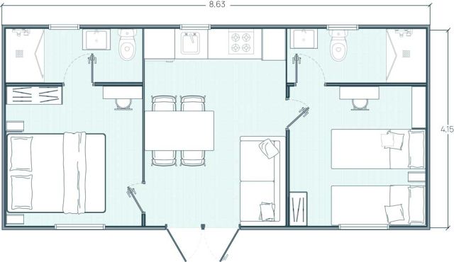 MOBIL HOME NEUF GAMME 2026. 2 CHAMBRES, 2 SALLES D'EAU . Châssis renforcé en acier galvanisé de type E220-Z-275 de haute résistance • Isolation renforcée (façade, du toit et du sol). • Fenêtres en PVC anthracite • Toit en tuile d’acier • Façade en vinyle haute résistance • Porte en aluminium vitrée anthracite• Projecteur LED extérieur • Prise étanche extérieure •