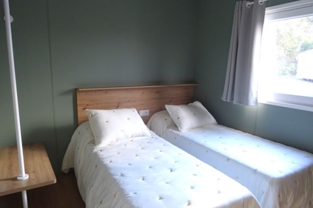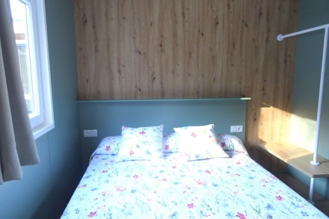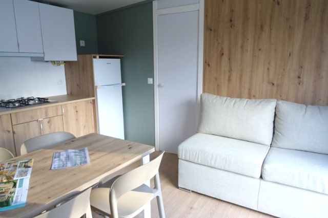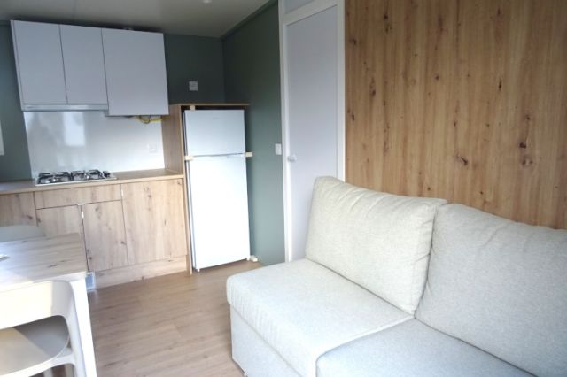 Eclairage LED à l’intérieur du mobil home • Revêtement de sol en vinyle de haute résistance. • Portes intérieures en mélamine • Les murs intérieurs sont recouverts d’un revêtement mural en mélamine facile à nettoyer avec une finition textile.