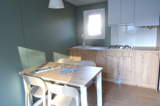 Cuisine : Meubles hauts et bas ainsi qu’armoires de rangement avec portes à fermeture amortie • Plaque de cuisson à gaz • Réfrigérateur à deux portes de 144 cm• Hotte aspirante extensible avec filtre à minéraux • Meuble avec tiroir pour couverts • Évier en acier inoxydable • Chauffe-eau étanche à gaz de dernière génération