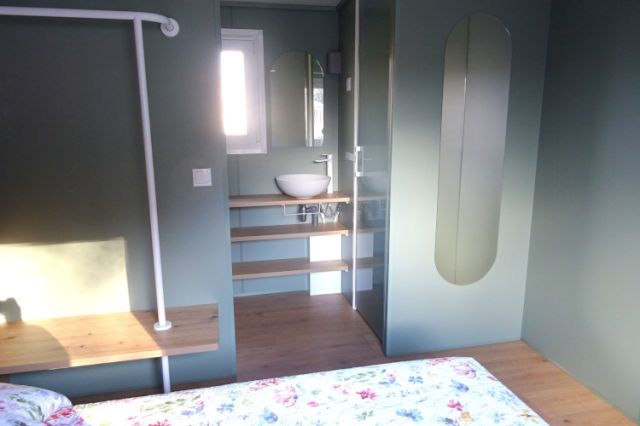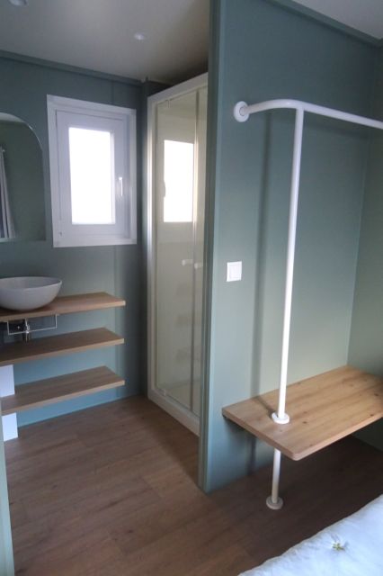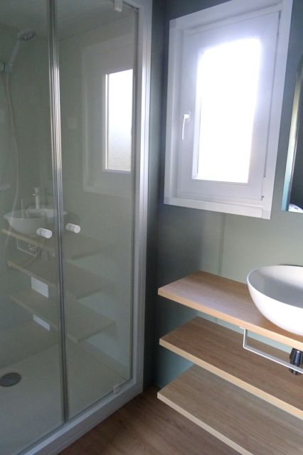 Salle d’eau: Cabine de douche avec paroi • Miroir • Lavabo avec étagères inférieures de mur à mur • Porte-manteau et porte serviettes. Prix mobil home hors options: 41369 €. Transport inclus 50 km. A visiter sur notre parc.