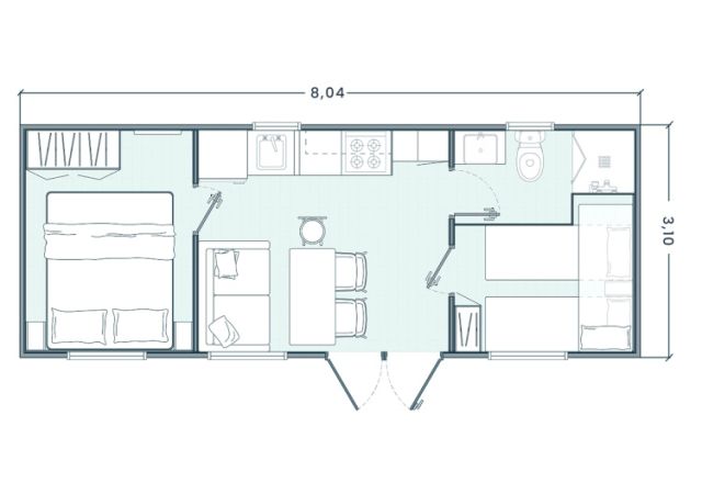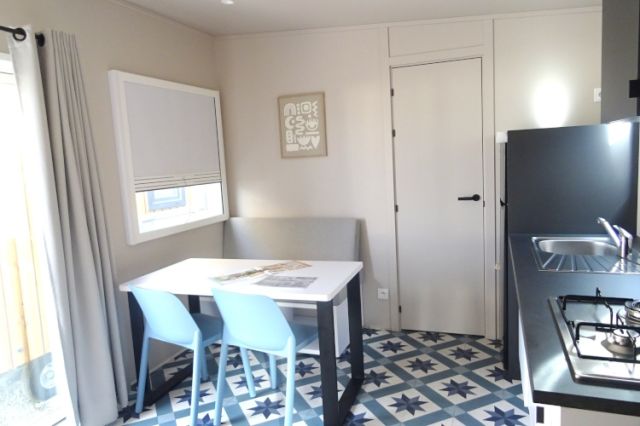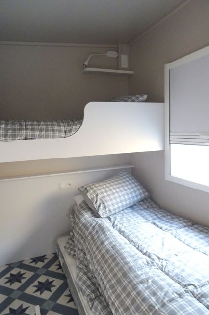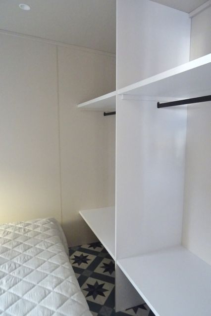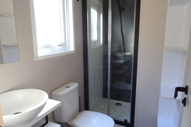 Châssis renforcé en acier galvanisé de type E220-Z-275 de haute résistance • Isolation renforcée de la façade, du toit et du sol • Lumière d’urgence et détecteur de fumée • Eclairage LED à l’intérieur du mobil home • Revêtement de sol en vinyle de haute résistance. • Portes intérieures en mélamine • Les murs intérieurs sont recouverts d’un revêtement mural en mélamine facile à nettoyer avec une finition textile.