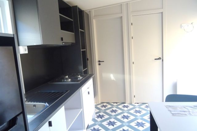Cuisine • Meubles hauts et bas ainsi qu’armoires de rangement avec portes à fermeture amortie • Cuisine avec plaque de cuisson à gaz. • Réfrigérateur à deux portes de 144 cm. • Hotte aspirante extensible avec filtre à minéraux • Meuble avec tiroir pour couverts • Évier en acier inoxydable • Chauffe-eau étanche à gaz de dernière génération.
